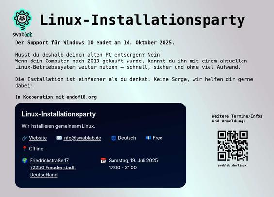 Linux-Installparty am 19.07. von 17 bis 21 Uhr im swablab💻